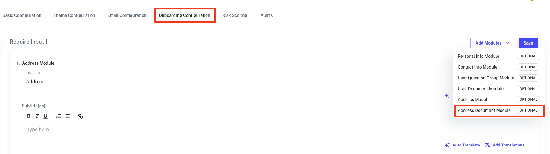 The Address Document Module enables structured and reliable Proof of Address (POA) verification as part of KYC. It replaces the legacy User Document Module – POA and provides stronger validation, configurable document rules, and support for multiple file types.