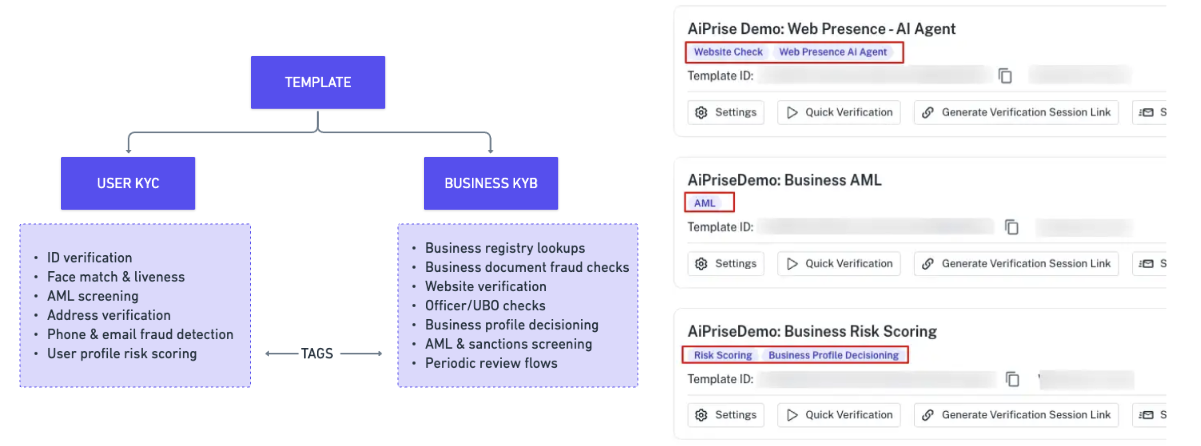 AiPrise supports both User (KYC) and Business (KYB) templates. Each template contains tags that represent the types of verification checks included in that template—such as ID verification, face match, business lookup, AML screening, risk scoring, fraud checks, and more. These tags act as descriptors to help you quickly identify what the template does and which checks it will perform during a verification.